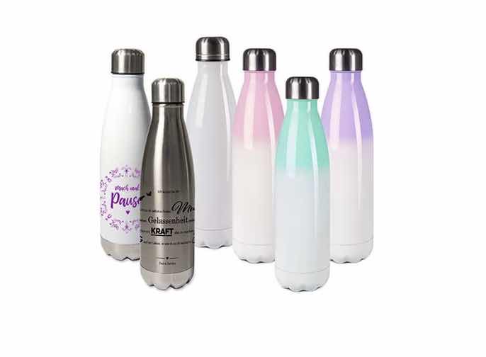 Thermos isotherm Personnalisé avec le prénom, un texte, une photo couleurs à choix: blanc, alu, dégradé rose, violet ou turquoise 500ml
